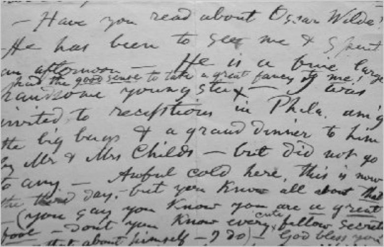Have you heard about Oscar Wilde? He has been to see me & spent an afternoon — He is a fine large handsome youngster. ^ (interlinear) he had the good sense to take a great fancy to me.
