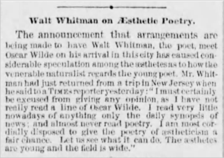Not long after arriving in New York in January 1882, at the start of Wilde's lecture tour of North America in 1882 Oscar Wilde expressed a fervent wish to meet the American poet Walt Whitman, whose works he had been familiar with from a young age.