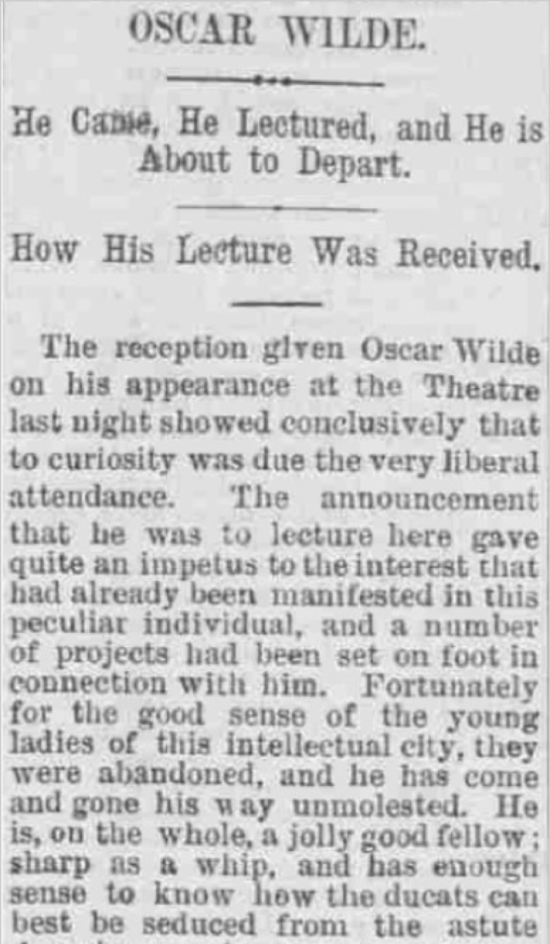The report of Wilde's lecture ran to more than two full page columns of the newspaper's front page. An interview with him appeared the following day.