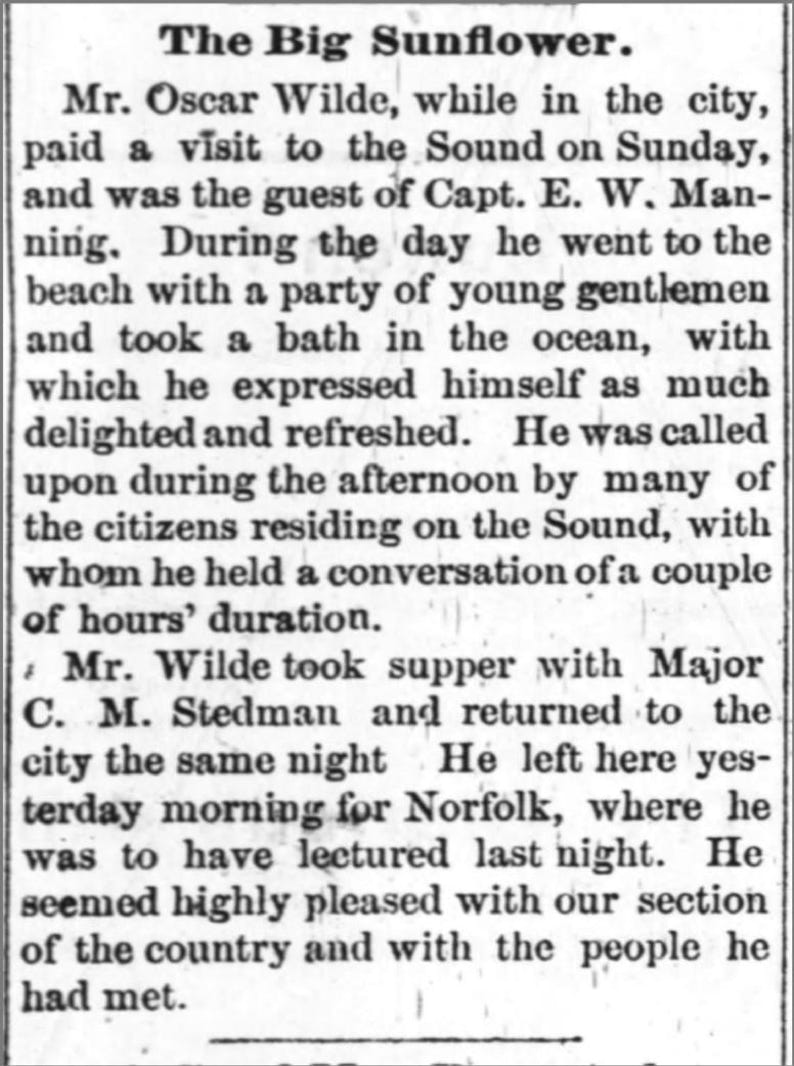Charles Manly Stedman who dined with Wilde in Wilmington had served in the 44th North Carolina Infantry during the Civil War on the Confederate side, and was a 41 year-old lawyer when he met Wilde. He became a long-serving Member of the U.S. House of Representatives from North Carolina's 5th district, and carried his memories of Wilde well into the new century: he died in 1930, aged 89.
