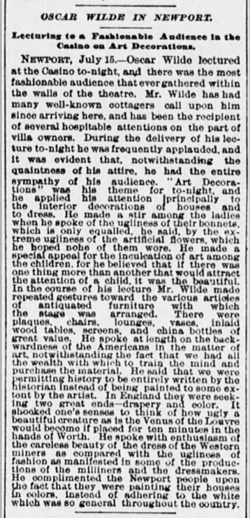 Wilde spent six days in Newport, and stayed at least one night (July 14) at ā€˜Oak Glen’, the Summer home of Julia Ward Howe, who had earlier received Wilde at her Boston home that year.Ā
