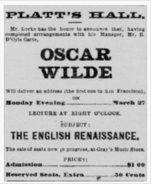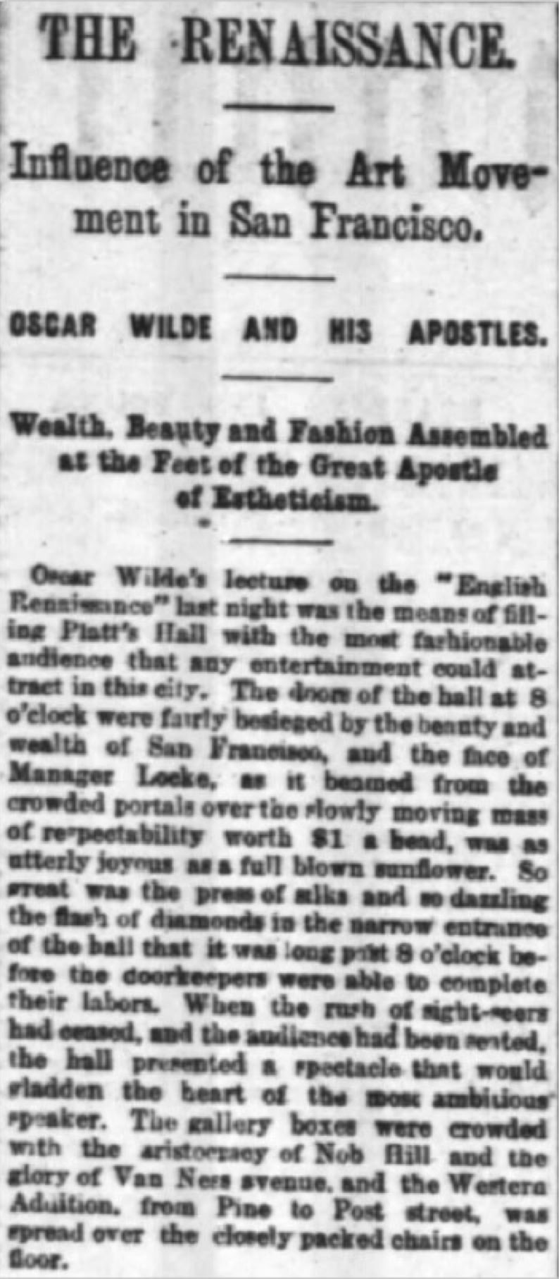 ‍Wilde, therefore, resurrected The English Renaissance for an additional lecture. The reason he had previously adapted this lecture was that it had proved 'too lengthy and theoretical for many in Wilde's audience' [1], and it is evident from the reported content that he delivered a variation of it in San Francisco.