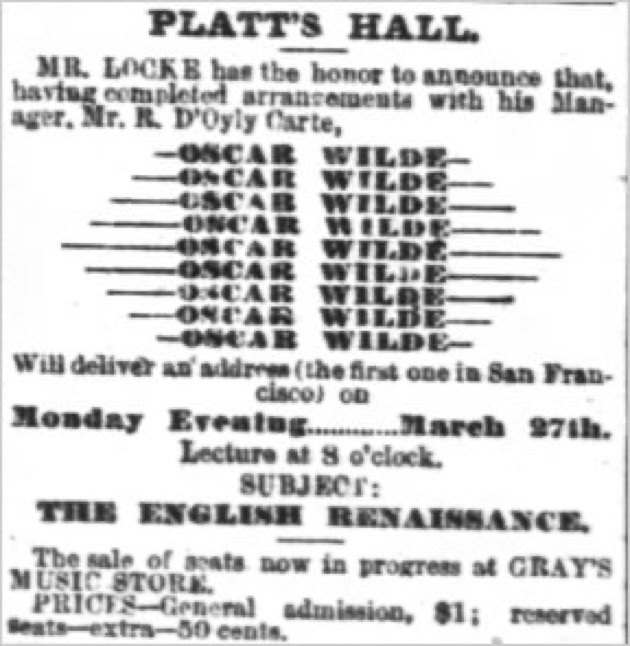 ‍At this point in in his lecture tour, Wilde was delivering two lectures: The Decorative Arts (which was an adaptation of his first lecture The English Renaissance) and The House Beautiful, which he reserved for when he lectured twice in the same city. In San Francisco, however, Wilde was scheduled to lecture four times.