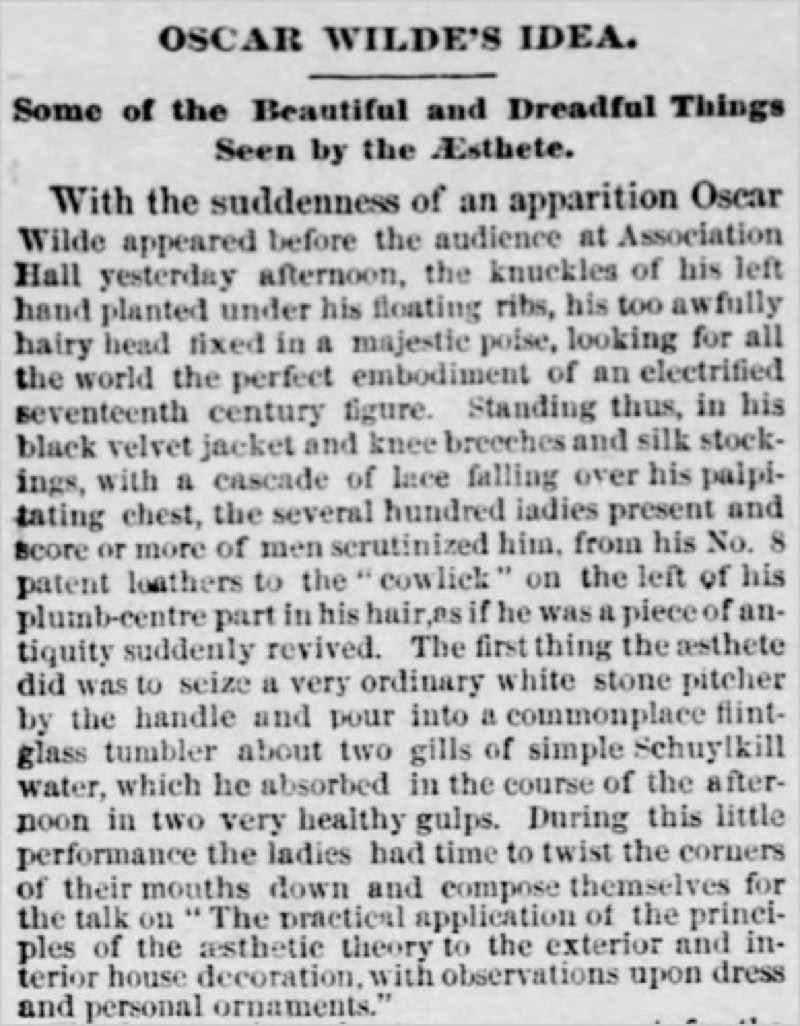 This latter reference to dress is an example of how Wilde was at this time was adding allusions to his subject matter that would eventually become a separate lecture (given in the UK and Ireland) and essay on the subject of Dress, a full history and exploration of which can be found in Oscar Wilde on Dress (John Cooper, 2013, 2025).