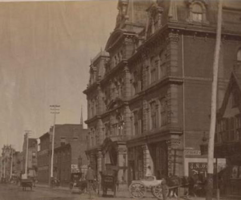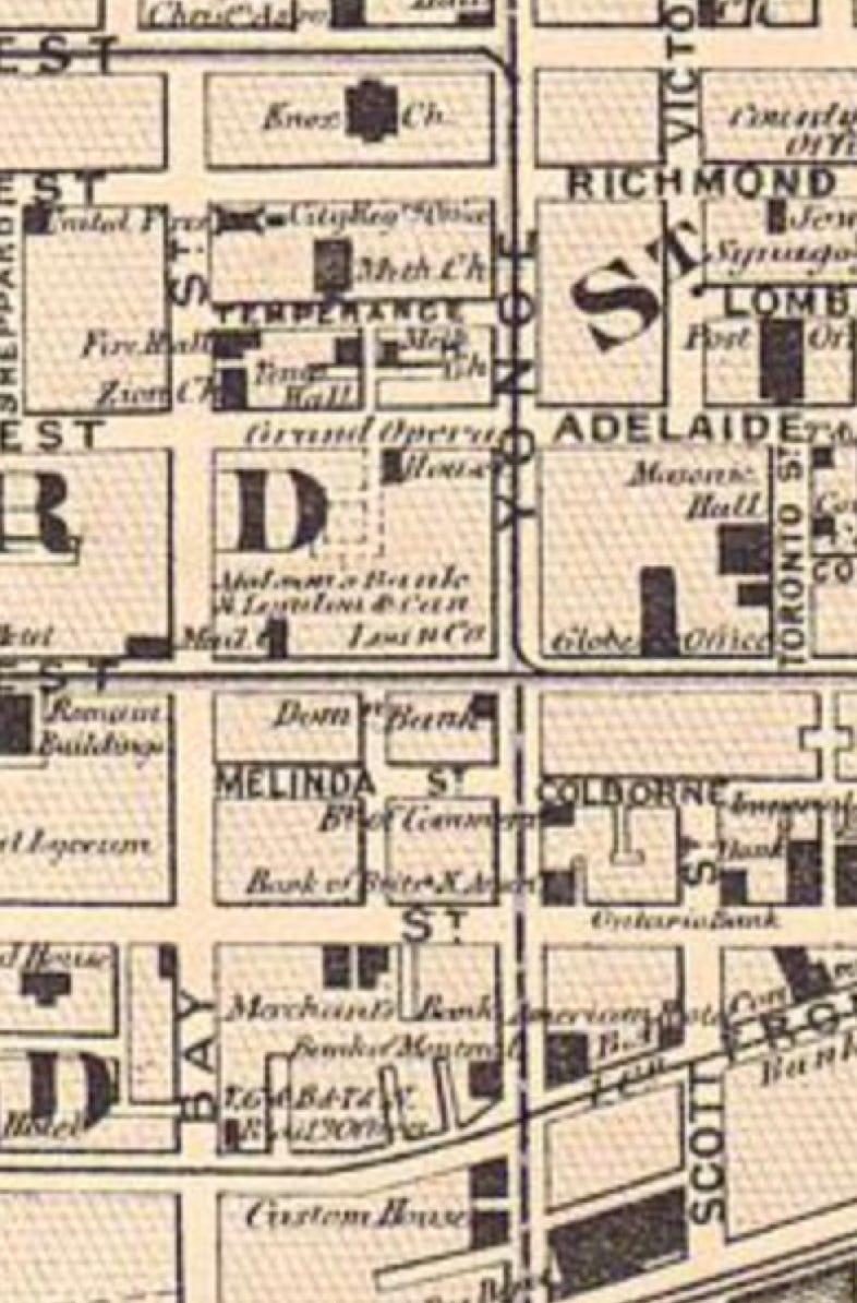 Location of the Grand Opera House at 11 Adelaide Street West, (south side between Yonge and Bay Streets, now 40 King Street West)
